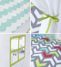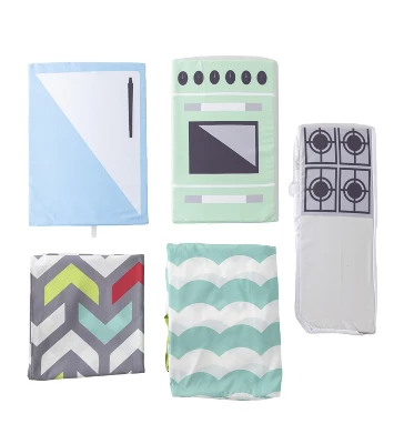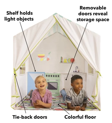 Baste, broil, bake, and braise…calling all junior chefs and aspiring entrepreneurs to cook up imaginative play with our Kitchen Playhouse Tent and Cooking Set! The roomy 44″L x 44″W x 50″H polyester play tent with sturdy plastic poles gives kids their own space to play and “cook” alongside mom or dad. The retro-colored fabric appliances, colorful floor, and mint-green scalloped roof and trim will complement a playroom, bedroom, or family room. Tie-back doors and open windows offer plenty of light and air while they play.The back wall of this play tent features a shelf for kids to mix up their pretend ingredients. Doors below the refrigerator and stove remove with hook and loop tape, and offer plenty of storage space for kitchen utensils and toys (not included). Burners, sink, faucet, and other kitchen details printed on the interior of the tent add even more character.Set includes 7-Piece Jr. Chef’s Cooking Set (pot and pan with lid, whisk, spoon, spatula, and rolling pin).Perfect gift for kids who love pretend play and role-play. Adult assembly required.