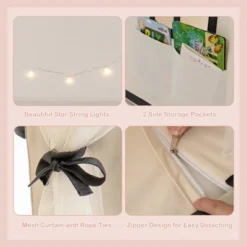 - Well-Ventilated Space & Storage Pockets: The door and windows are equipped with breathable mesh curtains which promote good air circulation inside the tent and allow parents to keep an eye on kids conveniently. Meanwhile, with rope ties, children can roll up or fall down the curtains at will. What’s more, the playhouse is designed with 2 side pockets to store kid’s toys, story books and other small items.