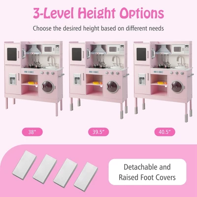 - 3-Level Available Heights: This pretend play kitchen offers 3-level height options that allow you to choose the desired height based on different needs. With the detachable and raised foot covers, you can adjust heights easily.