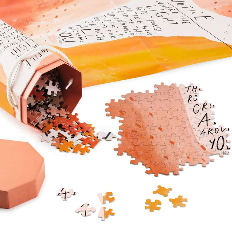 Create an oasis of fun and inspiration with this unique puzzle that features a thought-provoking quote paired with serene, warm-toned art from Morgan Harper Nichols. This 1,000-piece puzzle features a colorful orange, pink and coral design with hand lettering, and comes packaged in a pretty, octagonal box with a carrying handle. Totable puzzle is perfect for a graduation, wedding, birthday or new home gift. As a poet and artist, Morgan Harper Nichols pairs words of hope, self-acceptance, and perseverance with her designs to inspire and encourage people around the world.