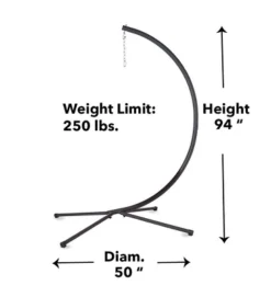 - Durable powder-coated steel Crescent Hanging Chair Stand includes two C hooks and a 16″ chain