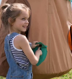 Kids who love hanging out with nature will feel right at home in our Woodland HugglePod HangOut®! Like having your own camouflage tree house, this sensory hanging tent blends into your backyard and is decked with green leaves, and even includes a pocket on the outside to exchange messages or leave a treat. Featuring three windows and an easy-entry fabric door, our award-winning hanging tent is constructed of weather-resistant nylon for indoor and outdoor use. The included comfy cushion makes for an even more relaxing spot! Extend play into the night with LED leaf-shaped lights inside the top of the play space. Set includes a durable powder-coated steel Crescent Hanging Chair Stand (50″ diam. x 94″H), complete with two C hooks and a 16″ chain that rotates 360°. Each component holds up to 250 lbs. Adult assembly and installation required. Imported. HangOut and Stand are not intended for use as a swing.
