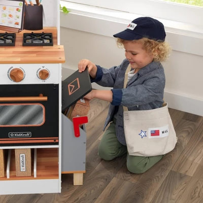 Meal plan just like mom and dad with the KidKraft Surprise Box Play Kitchen. Personalize the pre-packaged box of pretend food with cute messages, then place in the built-in mailbox and lift the flag to let them know their box has arrived. Kids will love opening up their newly delivered surprise of play food and accessories, then assembling everything to get cooking and even decorating for special occasions. Boxes store conveniently in slots underneath the oven when not in use. With a lights and sounds faucet, working ice maker and click-and-turn knobs, the action is realistic and non-stop fun.