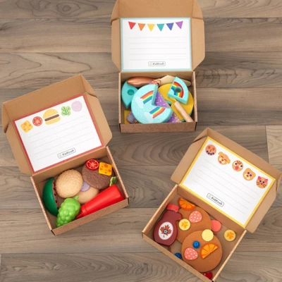 - Three themed food boxes: burgers, birthday and breakfast; felt toppings for textural exploration