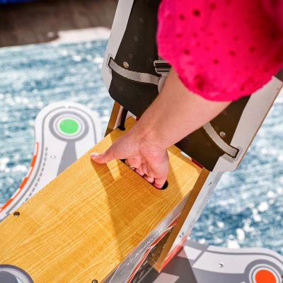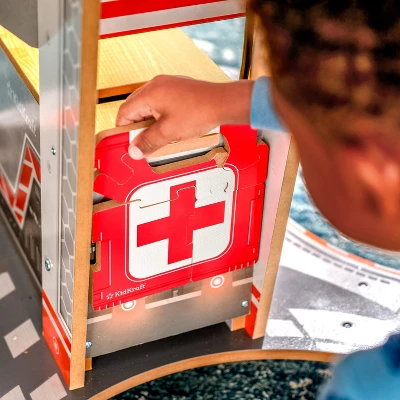 The sky’s the limit with the KidKraft Ultimate Helicopter! This amazing, immersive experience simulates all aspects of a real helicopter to make kids feel like they’re really flying. Start up the ignition and choose takeoff mode. The control panel comes to life with lights. Watch the propellers light up, then spin and make noises. Rock from side to side to active more lights and hear more sounds. Experience the feeling of twisting and turning in air. Fly into the clouds and switch to hover mode to search for people to rescue. Once someone is spotted, choose landing mode to make your descent. Grab the emergency kit off the back of the copter and get to work. Aim and shoot the grappling hooks or water cannons to help with your rescue. Report back to mission center via the communication button and hear real responses. Kids have the control of imagination at their fingertips with 15 tactile knobs, buttons and switches built in for extended hands-on play. Made of premium wood for infinite adventures, the Ultimate Helicopter from KidKraft opens up a sky full of possibilities to playtime.