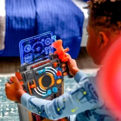 - 4-color, light-up control panel right at eye level for pretend navigation; communication mission button provides voice and sound effects