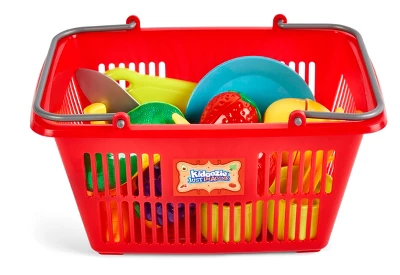 - Product Specifications: Set includes shopping basket with handles, fruits, vegetables, plates, cups, utensils, cutting board and a cutting knife. Recommended for children ages 2+