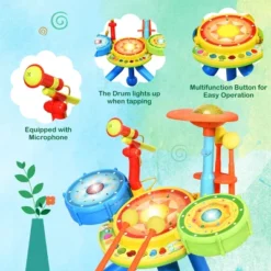 - Including a microphone, LED lights, 2 drumsticks and hangers, and a sturdy stool.