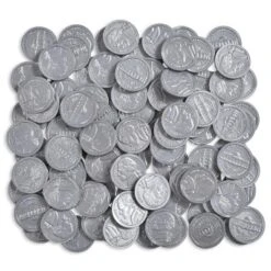 This set of 100 Play Nickels is an essential teaching and playtime resource. These realistic plastic nickels feature Thomas Jefferson’s face and a silver color. They are also the same size as real nickels! Children can use these coins during pretend play. Or, teach kids how to add, subtract and make change.Size of one nickel: 0.9″ dia.Set includes: 100 play nickels.