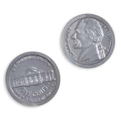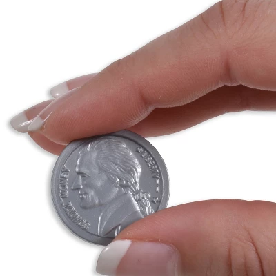 - REALISTIC PLAY NICKELS — These plastic pennies have a 0.9″ diameter, which is the same size as real American nickels. Thomas Jefferson’s face and the silver coin color add to their authenticity!