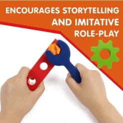 - ENCOURAGES STORYTELLING AND IMITATIVE ROLE-PLAY: Kids love to come up with stories and share them with you. They like to name their toy pieces and have them interact. This is an essential part of socialization, memory recall, and creativity for your child. Our toy tool box kit will make it easy for them to embrace their storytelling role.