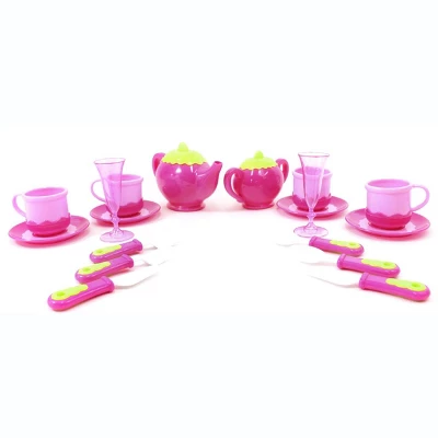 18-Piece Pink Plastic Deluxe Kids Pretend Play Tea Set is a durably constructed tea party set. What time is it? Tea time! This is the perfect tea set for your child to enjoy tea time with friends, family, and stuffed animals! This lovely pink tea set comes with a teapot, sugar bowl, 4 tea cups and saucers, and utensils.