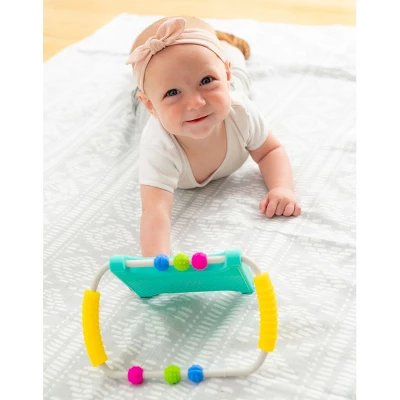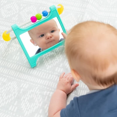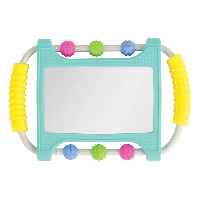 The Peeka(R) developmental mirror features an array of colorful and engaging elements designed to help children explore, learn, and grow. Adjust the multi-position stand for tummy time or held by baby. Babies can grasp the multi-textured handles for tactile stimulation and sensory exploration. Move the multi-texture balls along the top and bottom handles for midline play improving gross and fine motor skills. Little ones can engage in early stages of communication through smiling, babbling, and facial recognition. Children can observe their reflection in the clear sight mirror promoting cognitive development, eye contact, curiosity, and focus.