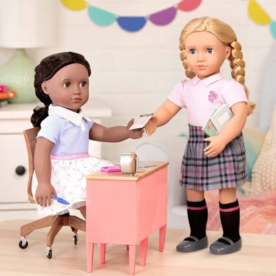 Prepare your 18-inch dolls for their school days in fun ways with the Our Generation Back-to-School Surprise Countdown Calendar! Open up each door and discover a new item every day – including a colorful backpack, tasty lunches, and a pretend laptop! This calendar accessory also features an activity page inside the front flap, and the 30 school items have realistic details for more pretend-play fun. Pack your pencils, pens, colors, and other supplies in the pink pencil case, then easily open the school bag and pack for your bestie’s big day! Flip open the laptop and start taking notes in the classroom, then insert the mini flash drive stick to save your work! This set includes: 4 colored pencils, ruler, compass, agenda, lunch paper bag, sandwich half, veggie container with lid, yogurt cup, spoon, juice container, opening pencil case, pencil, sharpener, scissors, highlighter, marker, sticky note pad, protractor, 6 colored pencils with case, glue, 10 sheets of paper, report card, homework sheet, notebook, 15 elastics, pretend calculator, 2 sticker sheets, flash drive stick, pretend laptop, heart-shaped eraser, and opening backpack. (Dolls sold separately)