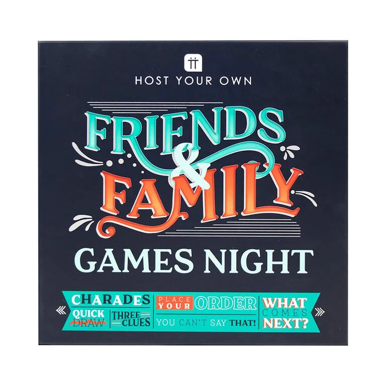 - Friends & Family Games Night board game incorporates 6 favorite games including charades, quick draw and three clues into one board game.