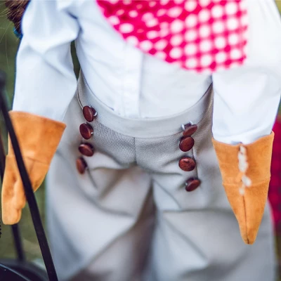 - Set includes gaucho pants, blouse, scarf, fringed faux-suede gloves and vintage style boots too!