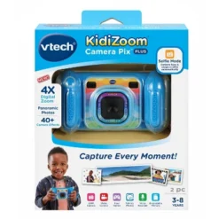 Focus on fabulous photos with the KidiZoom® Camera Pix™ Plus! Inspire curiosity with creativity tools and 40+ camera effects on this 2.0 megapixel camera with 4X digital zoom and 1.8″ screen. Create a Talking Photo using your own voice and photo. Apply voice-changing effects, then play it back—your photo appears to talk! In Photo Editor mode, add photo frames, stamps and more. Create a kaleidoscope, a photo collage, or make a video with loads of special effects. Expand your creativity with Panorama mode. Create a panoramic shot by stitching together two to five images. Experiment with Animation Maker and combine up to 100 photos with image overlay technology to create your very own animation. Ready to switch gears? Relax with four built-in games. Have fun with Recycle Rescue, Delivery Dash, Fast Flowers and Gift Tower. This rugged, kid-friendly camera with wrist strap is easy for little photographers to grip and hold. Expand the camera memory up to 32GB, and transfer files to a computer to save them (memory card and USB cable not included). Intended for ages 3–8 years. Requires 4 AA batteries. Batteries not included.